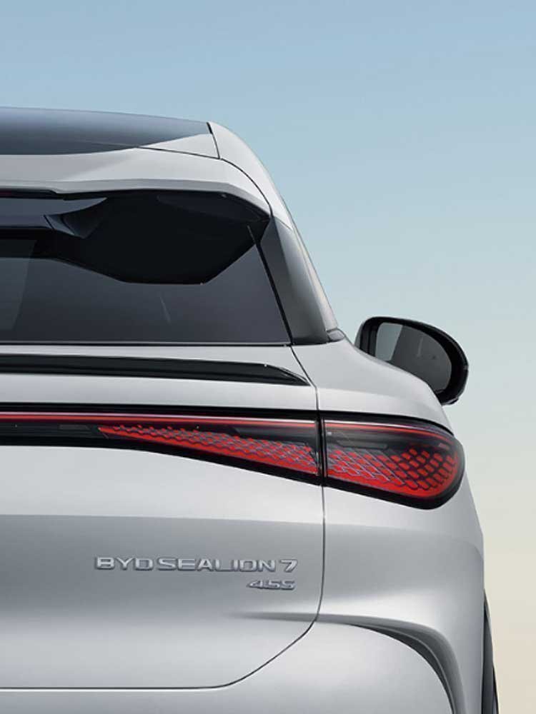 Desain lampu belakang BYD Sealion 7 menonjolkan gaya futuristis melalui garis cahaya ramping dan detail menyerupai tetesan air, menciptakan efek dinamis yang terinspirasi dari aliran air yang cepat.